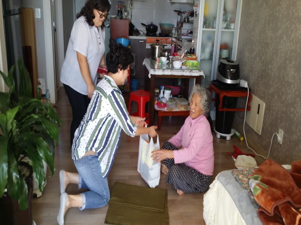 경기 동두천시 불현동 지역사회보장협의체 위원들이 지난 13일 정성 가득한 밑반찬을 만들어 소외계층 가정에 전달했다. 사진은 위원들이 노인에게 반찬을 전달하는 모습.