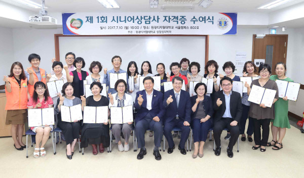 구의 노인상담센터 상담 봉사자 33명은 최근 원광디지털대학교에서 시행한 자격증 시험을 통해 ‘제1회 시니어상담사 자격증’을 취득해 지난 7월 원광디지털대에서 열린 ‘시니어상담사 자격증 수여식’에서 자격증을 수여 받았다.