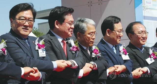 더불어민주당 우원식(왼쪽부터)·자유한국당 정우택·국민의당 김동철·바른정당 주호영·정의당 노회찬 원내대표 등 여야 원내대표가 14일 국회 잔디광장에서 열린 `국회 취업박람회' 개막식에서 손을 잡고 있다.