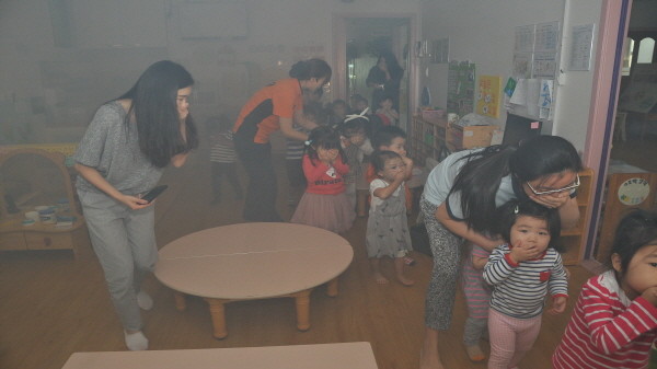 서울 동작소방서는 지난 14일 오전 지도교사와 원생 70여명이 참여한 가운데 구립사당어린이집에서 화재 대피훈련과 소방안전교육을 실시했다. 사진은 어린이들이 연기대피 체험을 하는 모습.(사진제공=동작소방서)