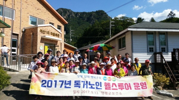경기 양평군보건소는 지난 6·13일 양일간 지역노인 80여명을 대상으로 ‘심신 힐링 헬스투어’를 개최했다. 사진은 행사에 참여한 노인들이 투어 출발에 앞서 석산1리 마을회관 앞에서 기념촬영을 하는 모습.(사진제공=양평군청)