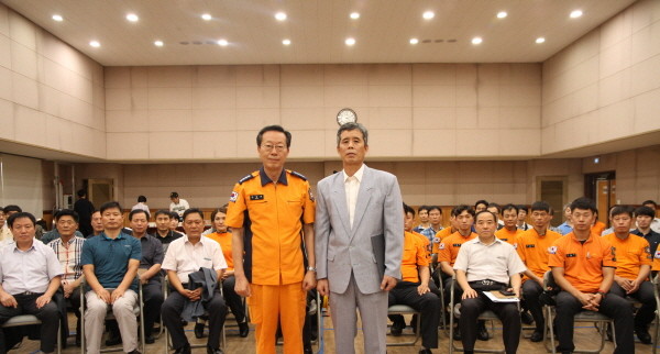 서울 구로소방서는 지난 13일 3층 강당에서 화재진압 유공시민 김기원씨에 대한 표창수여식을 가졌다. 김씨는 지난 8월8일 오후 2시13분쯤 금천구 소재 지하주차장에 주차돼 있던 차량에서 화재가 발생하자 소화기로 화재를 진압했다. 사진은 장현태 서장이 김씨와 기념촬영을 하는 모습.(사진제공=구로소방서)