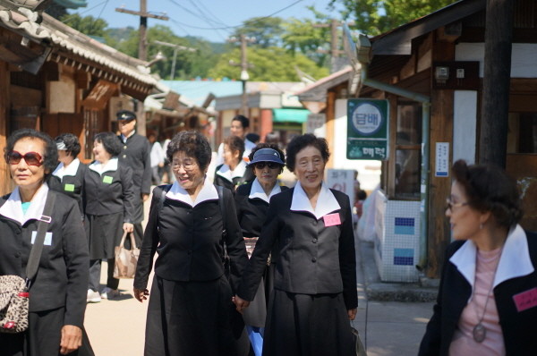 지난 14일 서울 강동구 명일2동은 직능단체협의회, 민관기관 등과 협력해 홀몸노인, 저소득층 등의 노인 20명을 대상으로 ‘청춘교복파티’를 실시했다. 사진은 교복을 입고 거리를 걸어다니는 노인들의 모습.(사진제공=강동구청)