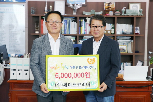 경기 이천시 백사면 도립리 소재 (주)세이프코리아는 지난 14일 이천시를 방문해 어려운 가정의 자녀를 위한 장학금으로 써달라며 행복한 동행 성금 500만원을 기탁했다. 사진은 조병돈 시장(오른쪽)과 (주)세이프코리아 대표가 기념촬영을 하는 모습.(사진제공=이천시청)