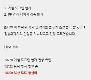 안내문에 따르면 롤 서버의 장애 관련해 “게임 로그인과 RP 결제 페이지 접속이 불가능해 현재 담당 부서에서 문제를 확인하고 있다”고 밝혔다.