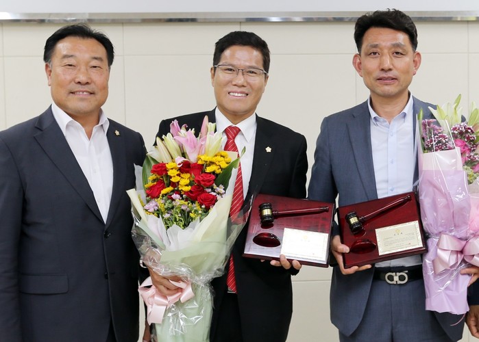 최근 경기 중부권 9개 시의회 의장협의회 의정활동 우수의원 시상식이 안양시의회 소회의실에서 열려 광명시의회 오윤배, 김익찬 의원이 우수의원상을 수상했다.사진은 왼쪽부터 광명시 이병주 의장, 김익찬 의원, 오윤배 의원이 꽃다발을 들고 포즈를 취하고 있는 모습.
