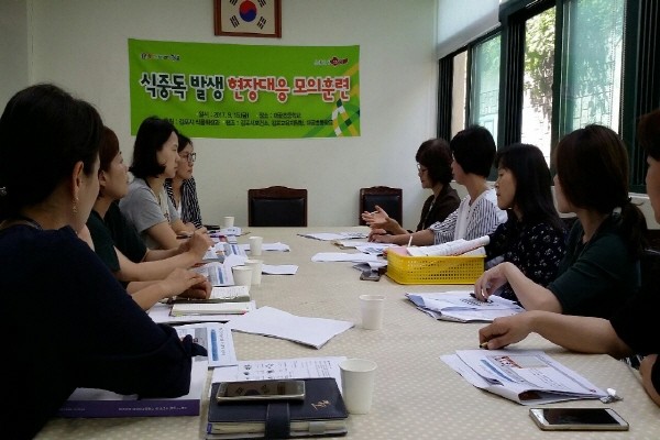 경기 김포시는 최근 학교 식중독 발생이 대규모로 확산되고 있는 데에 따라 이를 예방하기 위한 ‘식중독 발생 현장대응 모의훈련’을 대곶초등학교에서 실시했다. 사진은 훈련 관계자들이 식중독 예방관련 대책회의를 하는 모습.(사진제공=김포시청)