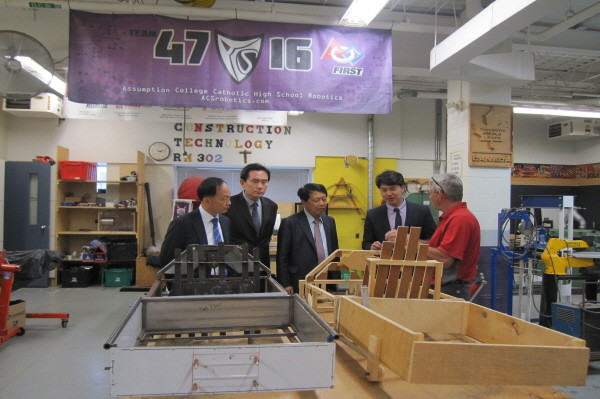 구로구가 최근 캐나다 온타리오주 윈저시청을 방문해 드류 딜켄스 시장을 만나 우호교류 협약서에 사인하고 양 도시 간 교류협력 방안에 대해 논의했다. 사진은 윈저시에 있는 한 기업체를 방문한 이성 구청장(가운데)이 업체 관계자로부터 설명을 듣는 모습.(사진제공=구로구청)