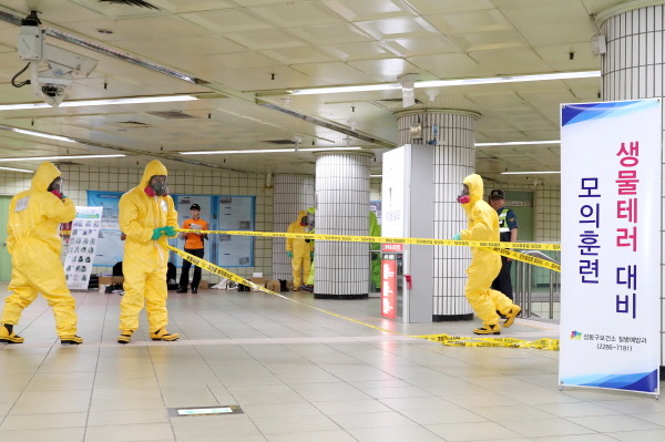 성동구보건소는 최근 추석연휴를 대비해 왕십리역 고객센터 앞에서 5개 유관기관과 합동으로 ‘생물테러 대비 모의훈련’을 실시했다. 사진은 훈련에 참가한 관계자가 모의 테러상황을 가장해 원점 보존을 하고 있는 모습.(사진제공=성동구청)