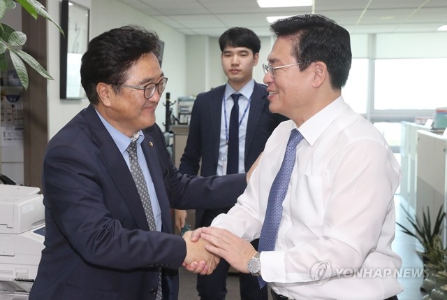 더불어민주당 우원식 원내대표(왼쪽)가 18일 오전 국회 의원회관 내 자유한국당 정우택 원내대표 방을 찾아와 김명수 대법원장 후보자 청문보고서 채택 등 현안을 논의한 뒤 떠나며 악수하고 있다.