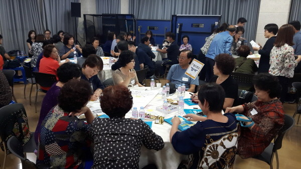 금천구가 독산3동 주민센터 대강당에서 50여명의 주민에 참석한 가운데 주민 소통, 공감, 화합을 위한 ‘울 동네를 바꾸는 토론회’를 개최했다. 사진은 주민들이 쓰레기 문제해결 방안에 대한 토론을 진행 중인 모습.(사진제공=금천구청)