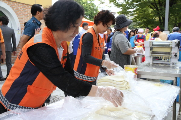 서울 구로소방서는 지난 18일 서울 금천한내 어르신종합복지관에서 서울시의회축구단에서 주최하는 지역주민과 함께하는 '자장면 무료 나눔행사'에 소방공무원 10명 및 의용소방대 30명이 참석했다. 사진은 참여자들이 자장면을 만들기 위해 밀가루를 반죽하는 모습.(사진제공=구로소방서)