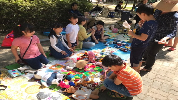 경기 수원시 팔달구 화서2동 주민센터가 최근 숙지초등학교 앞 공원(초록놀이터)에서 가정에서 쓰지 않게 된 물건들을 교환ㆍ판매하는 ‘꽃뫼마을 벼룩시장’을 개최했다. 사진은 벼룩시장에서 아이들이 물건을 사고 팔고 있는 모습.(사진제공=수원시청)