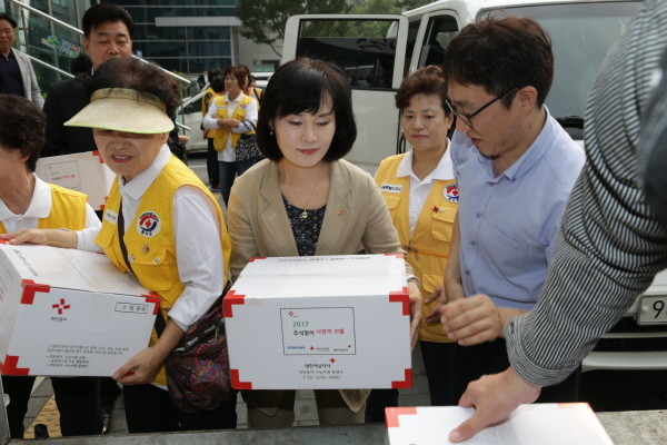 이날 성흠제 의장, 소심향 부의장, 김규배 행정복지위원장, 조수학 의원, 신성진 의원은 대한적십자봉사회 은평지부 협의회원들과 함께 행정기관에서 추천받은 지역내 취약계층에게 지원할 주·부식 세트 500여개의 구호품을 행정차량에 싣고, 관계자들을 격려했다.