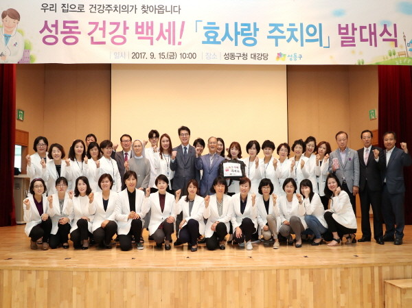 최근 서울 성동구는 백세시대를 준비하자는 차원에서 전국 최초로 시도하는 공공의료복지사업인 ‘효사랑 주치의 사업’의 발대식을 개최했다. 사진은 정원오 구청장(가운데)과 효사랑 주치의 사업에 참여하는 관계자들이 기념촬영을 하는 모습.(사진제공=성동구청)