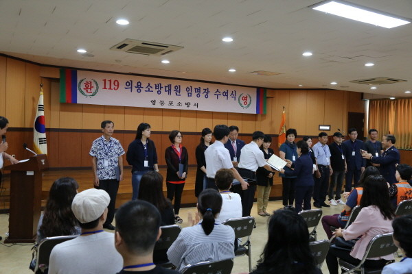 영등포소방서는 지난 19일 오후 2시 소방서 4층 강당에서 의용소방대원 정기교육 및 신규 의용소방대원에 대한 환영회를 진행했다. 사진은 의용소방대원에 대한 임명장 수여식이 진행 중인 모습.(사진제공=영등포소방서)
