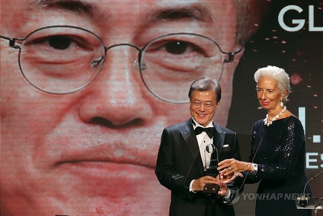 문재인 대통령이 19일 오후 (현지시간) 뉴욕 인트레피드 해양항공우주박물관에서 크리스틴 라가르드 IMF총재로부터 대서양협의회 세계시민상을 수상하고 있다.