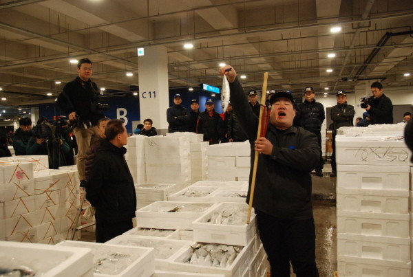 | ▲ 제5회 바다축제에서 시장 상인이 생선을 들고 모의경매를 진행하고 있다. | ||