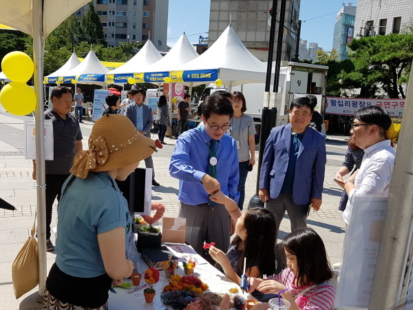 최근 성동구는 왕십리광장 일원에서 헨드메이드 개인·업체 30팀이 참석한 가운데 ‘제4회 고수(高手) 핸드메이드마켓’을 개최했다. 사진은 정원오 구청장이 행사장 부스를 방문해 체험활동에 참여하고 있는 어린이와 이야기를 나누고 있는 모습.(사진제공=성동구청)
