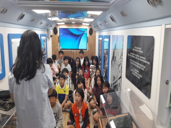 경기 연천군 백학초등학교 학생들은 학교를 방문한 ‘국가보훈처 나라사랑이동교실버스’에서 열린 ‘나라사랑 체험교육’에 참여했다. 사진은 나라사랑 체험교육에 참여한 백학초 학생들이 안보교육을 받고 있는 모습.(사진제공=연천교육청)