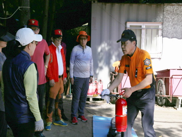 강남소방서는 지난 20일 오후 구룡마을에서 찾아가는 소방안전교육을 실시했다. 사진은 소방관이 주민들에게 소화기 사용 방법에 대해 설명하는 모습.(사진제공=강남소방서)