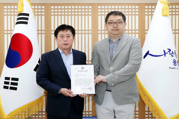 지난 20일 정찬민 경기 용인시장은 버스 운전기사가 의식을 잃은 상황에서 운전대를 갓길로 틀어 대형사고를 막아내 보건복지부로부터 ‘의상자(義傷者)’로 선정된 치과의사 이재호씨(40)에게 증서를 전달했다. 사진은 정 시장(왼쪽)과 이씨가 기념촬영을 하는 모습. (사진제공=용인시청)