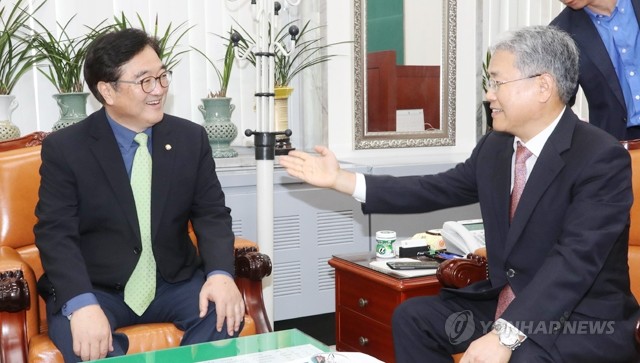 더불어민주당 우원식 원내대표(왼쪽)가 21일 오후 국회에서 열린 본회의에서 김명수 대법원장 후보자의 임명동의안을 통과시킨 뒤 국민의당 원내대표실을 찾아 김동철 원내대표와 밝은 표정으로 대화하고 있다.