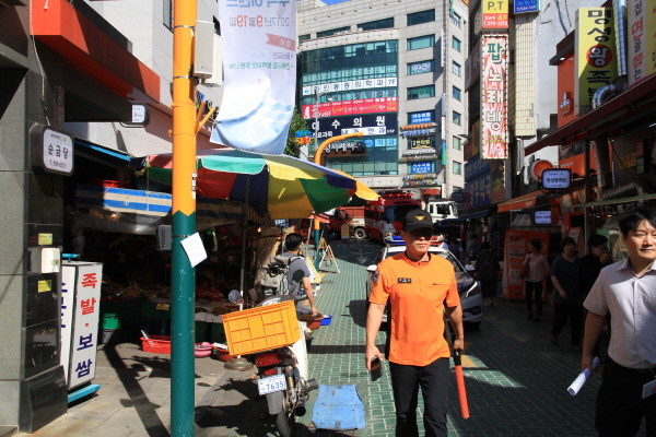 서울 동작소방서는 지난 20일 오후 2시 사당2동 소재 남성사계시장에서 추석 대비 유관기관 합동 소방통로확보훈련을 실시했다. 사진은 소방차 길터주기 훈련이 진행 중인 모습.(사진제공=동작소방서)