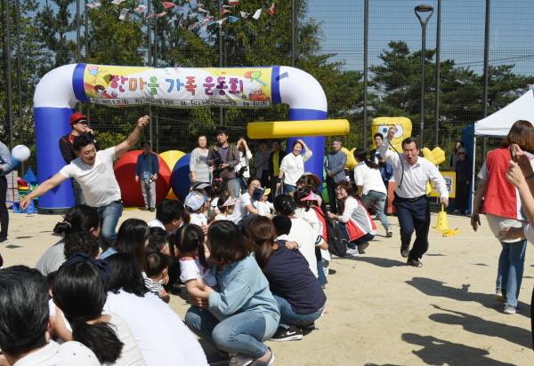 중랑구는 지난 21일 망우저류조공원 운동장에서 영·유아 1500여명이 참여한 가운데 ‘꿈나무 체육대회’를 열었다. 사진은 나진구 구청장이 체육대회에 참석해 영·유아 부모와 함께 게임을 하는 모습.(사진제공=중랑구청)