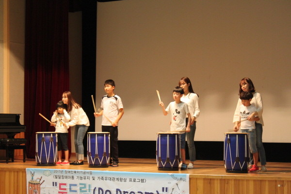 최근 경기 오산남부종합사회복지관은 ‘2017년 장애인복지기금’과 함께 14명의 발달장애아동이 출연하는 난타발표회 ‘두드림’ 행사를 진행했다. 사진은 난타발표회에 참여한 아동들이 공연을 이어가고 있는 모습.(사진제공=오산시청)