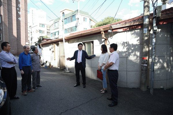 최근 홍국표 서울 도봉구의원(쌍문 1·3동, 창 2·3동)은 지역내 쌍문1동 계성경로당을 현장방문해 지붕·벽면 등 시설의 안전성을 점검한 후 구청 관계자와 경로당 이용 노인들의 의견을 청취했다. 사진은 홍 의원(가운데)과 구청 및 경로당 관계자들이 이야기를 나누는 모습.(사진제공=도봉구의회)