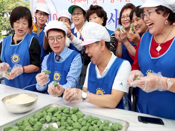 최근 서울 성동구 바르게살기운동협의회는 왕십리광장에서 정원오 구청장과 협의회원 50명 등이 참석한 가운데 ‘제9회 한가위 사랑의 송편나눔 행사’를 개최했다. 사진은 정 구청장(왼쪽에서 두번째)과 협의회원들이 송편을 빚고 있는 모습.(사진제공=성동구청)