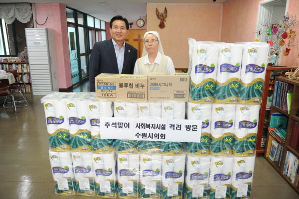 경기 수원시의회는 최근 염상훈 부의장이 지역내 노인·장애인·아동복지시설을 방문해 시의회에서 준비한 격려물품을 전달했다고 밝혔다. 사진은 염 부의장이 격려물품을 전달한 뒤 시설 관계자와 기념촬영을 하고 있는 모습. (사진제공=수원시의회)