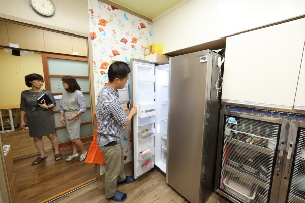 서울 금천구는 지난 25일 가산동 드림홈스쿨 지역아동센터에서 (사)해피기버와 사회 공헌 활동 전달식을 가졌다. 이날 해피기버는 아동센터에 160만원 상당의 새 냉장고를 후원했다. 사진은 해피기버 관계자가 아동센터에 전달한 냉장고를 살펴보는 모습.(사진제공=금천구청)