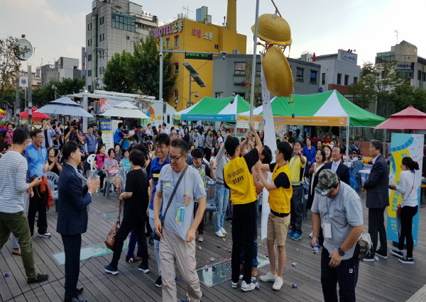 성북구가 최근 구청 앞 바람마당에서 마을공동체와 사회적기업, 협동조합, 자활기업 등 60여개 단체가 참여한 가운데 마을공동체·사회적경제 한마당 '열려라 함께!'를 개최했다. 사진은 참여자들이 박 터뜨리기 퍼포먼스를 통해 행사 시작을 알리는 모습.(사진제공=성북구청)