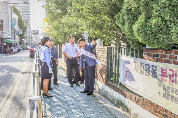 인천 계양구가 26일 계산동 소재 부평초등학교 앞에서 어린이 교통사고 예방 및 안전한 통학로 확보를 위한 ‘시민단체와 연계한 교통사고 줄이기 캠페인’을 실시했다. 사진은 박형우 구청장이 관계자들과 함께 통학로를 점검하는 모습.(사진제공=계양구청)