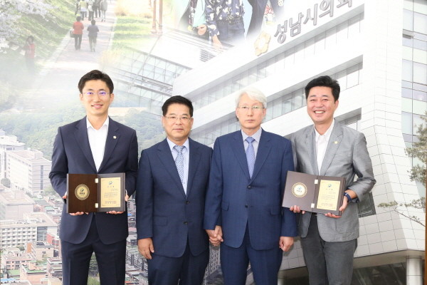 | ▲ 경기 성남시의회 안광환 의원과 어지영 의원이 대한전문건설협회 경기도회로부터 감사패를 받은 뒤 관계자들과 기념촬영을 하고 있다. | ||