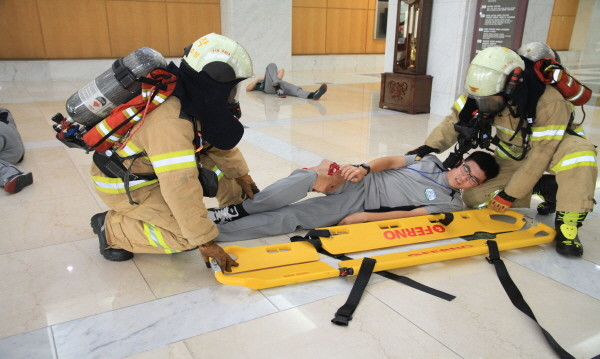 동작소방서는 지난 26일 동작구 농심관 앞 광장에서 적 포격도발 대비 민·관·군 합동훈련을 실시했다. 이날 훈련에는 2051부대, 동작구청, 동작경찰서, 동작보건소 등 6기관, 200명이 참여했다. 사진은 참여자들이 부상자 응급처치 훈련을 하는 모습.(사진제공=동작소방서)