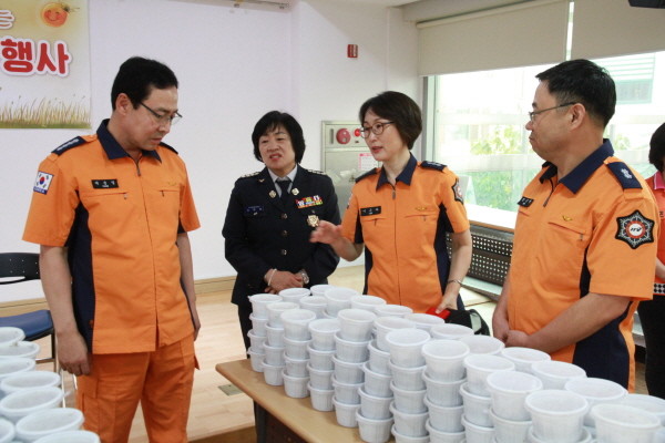 서울 마포소방서는 지난 26일 구립 마포 어르신돌봄 통합센터에서 소방서 의용대원들과 함께 ‘추석맞이 사랑의 반찬 나눔’ 행사를 진행했다. 사진은 박순일 서장 및 관계자들이 반찬을 살펴보는 모습.(사진제공=마포소방서)