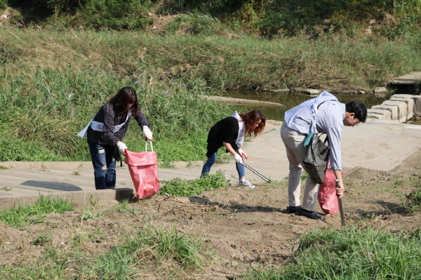 지난 26일 현대백화점 서울 구로구 디큐브시티점이 주민, 구청 직원 등 200여명과 함께 도림천 신정교~구로1교 약 3km 구간에 걸쳐 둔치, 제방, 산책로 주변에 버려진 쓰레기와 오물을 제거하는 수질개선 정화활동을 펼쳤다. 사진은 쓰레기를 줍고 있는 참가자들의 모습.(사진제공=구로구청)