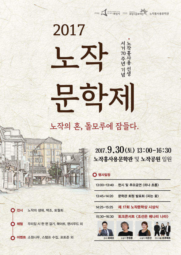 <노작문학제>는 동인지 ‘백조’ 창간에 참여하고 극단 ‘토월회’를 이끌었던 노작 홍사용 선생을 기리며, 시민들이 참여하고 즐기는 문학축제로 올해는 홍사용 선생의 서거 70주년을 맞아 헌시 및 추모공연 ‘하나 초롱’과 회원들의 발표회 ‘피는 꽃’, 본행사인 ‘제17회 노작문학상 시·희곡부문 시상식’, 행사의 대미를 장식하는 토크 콘서트 ‘조선은 메나리 나라’까지 3개의 파트로 진행된다.