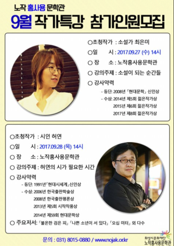 또한 문학제 주간인 9월 27일 수요일 에는 소설가 최은미의 ‘소설이 되는 순간’을 주제로 한 작가특강, 9월 28일 목요일에는 시인 허연의 ‘시가 필요한 시간‘ 등의 특강이 진행된다. 모든 프로그램은 무료이며 예약은 홍사용문학관 또는 홈페이지에서 가능하다.