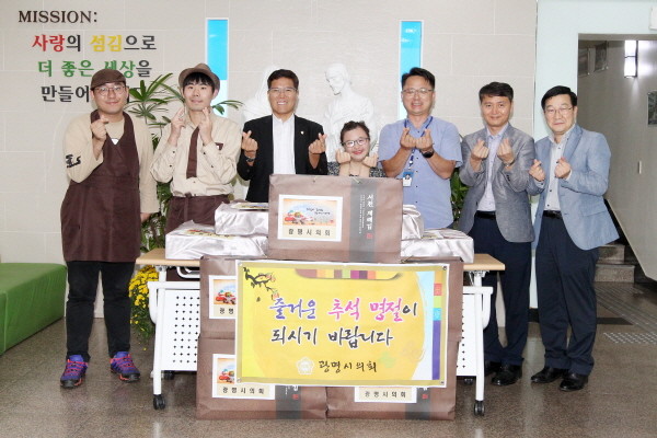 27일 김익찬 경기 광명시의회 의장(왼쪽에서 세번째)은 추석 명절을 앞두고 광명장애인종합복지관을 방문해 즐거운 명절을 보낼 수 있도록 위문품을 전달했다.