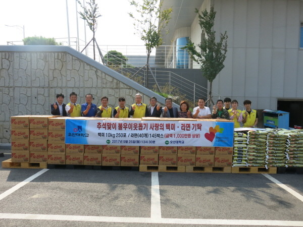 최근 경기 오산시 신장동 행정복지센터는 추석을 맞이해 오산대학교로부터 지역내 저소득 취약계층을 위한 사랑의 백미와 라면을 기탁받았다. 사진은 기탁식 후 동 및 오산대 관계자 등이 기념촬영을 하는 모습.(사진제공=오산시청)