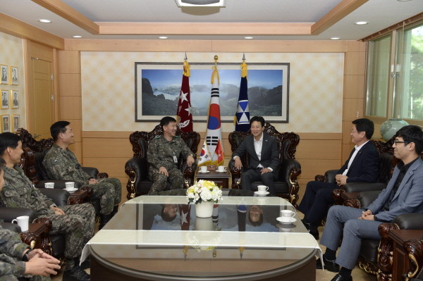 경기 포천시 통합방위협의회는 추석을 맞이해 지난 27일 협의회장인 김종천 시장을 비롯한 협의회원 등이 참석한 가운데 지역내 주요 군부대 및 유관기관을 위문했다. 사진은 김 시장(오른쪽에서 세번째)과 김성진 육군 제6군단장(오른쪽에서 네번째)이 이야기를 나누는 모습.(사진제공=포천시청)