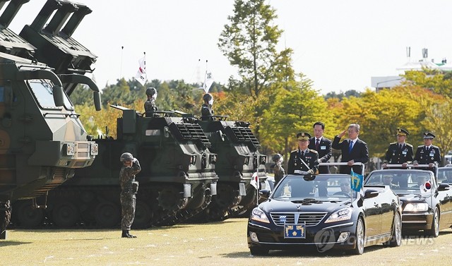 28일 오전 경기도 평택 해군 2함대사령부에서 열린 건군 69주년 국군의 날 기념식에서 문재인 대통령이 사열하고 있다.