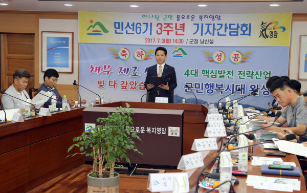 ‘하나된 군민 풍요로운 복지영암’건설을 목표로 민선6기 지난 3년 동안 초심을 잃지 않고 오직 6만 군민과 16만 향우를 생각하면서 달려 온 시간들은 매일 매일 영암의 새 역사를 써 내려가고 있다.