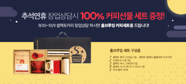 셀렉토키피는 추석 연휴 기간 중 1:1 창업컨설팅을 진행하는 예비 창업자 전원에게는 6만원 상당의 셀렉토커피 홈브루잉 선물세트를 증정한다.