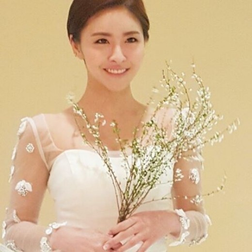 사진 속 진예솔은 짧은 머리를 깔끔하게 묶고 웨딩드레스를 입고 있다. 수수한 꽃다발이 단아한 미모를 더욱 부각시킨다. 환한 미소가 밝은 분위기를 자아내고 있다.
