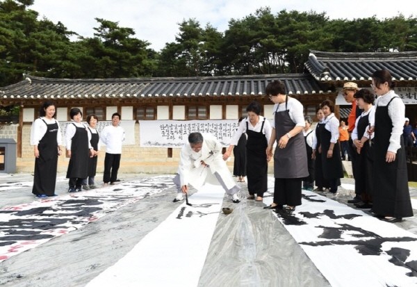경기 여주시는 지난 9일 능서면 왕대리 소재 세종대왕릉(영릉) 일원에서 ‘훈민정음 반포 571돌 기념 한글날 문화제 경축식’을 개최했다. 사진은 경축식에 참석한 원경희 시장(가운데)이 붓글씨를 쓰고 있는 모습.(사진제공=여주시청)